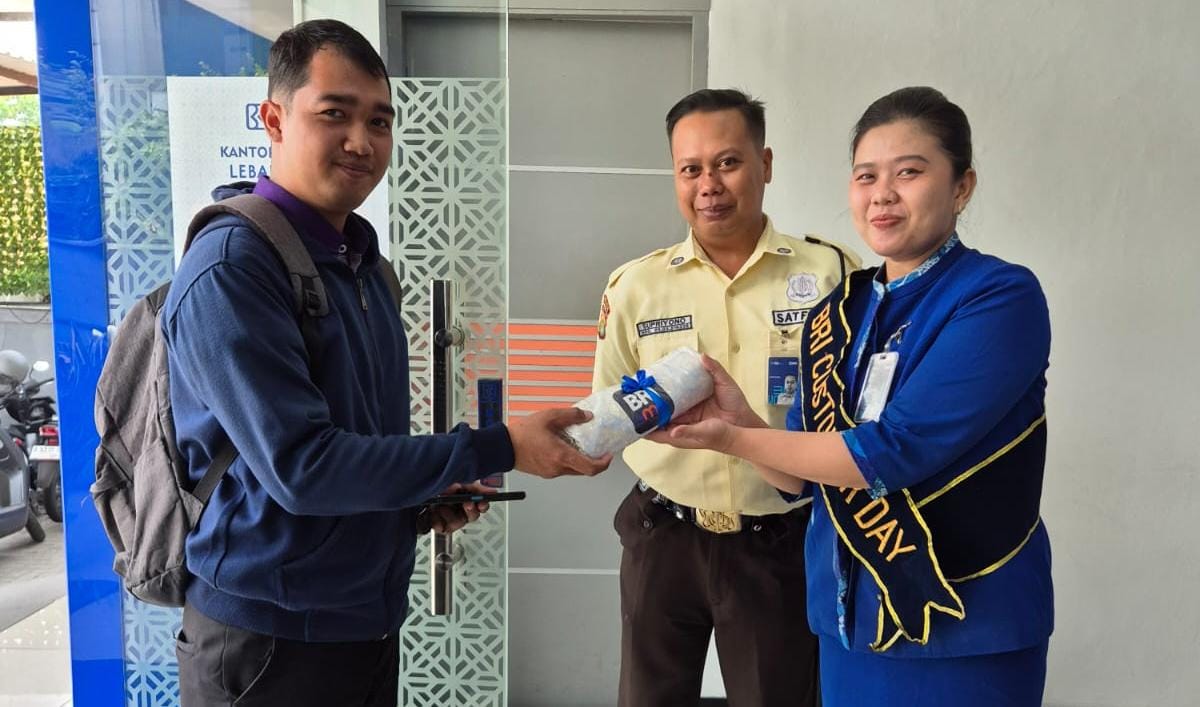 Pemimpin Cabang BRI BO Lebak Bulus Edy Siswanto bersama staf dengan penuh keramahan menyapa para nasabah, bahkan memberikan gift kepada 10 nasabah pertama.