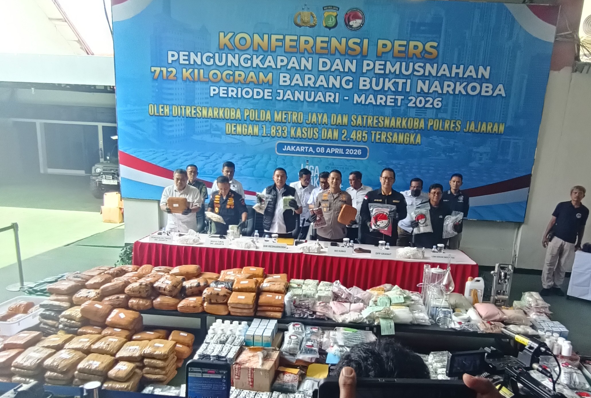 Jakarta, JNcom – Ditresnarkoba Polda Metro Jaya dan Satresnarkoba Polres Jajaran berhasil mengungkap dan melaksanakan pemusnahan barang bukti narkoba seberat 712 Kilogram selama periode Januari-Maret 2026. Pemusnahan barang bukti narkoba dipimpin langsung oleh Direktur Reserse Narkoba Polda Metro Jaya, Kombes Pol. Ahmad David S.I.K., M,H, Rabu (8/4/2026), di halaman kantor Ditresnarkoba Polda Metro Jaya Jakarta.