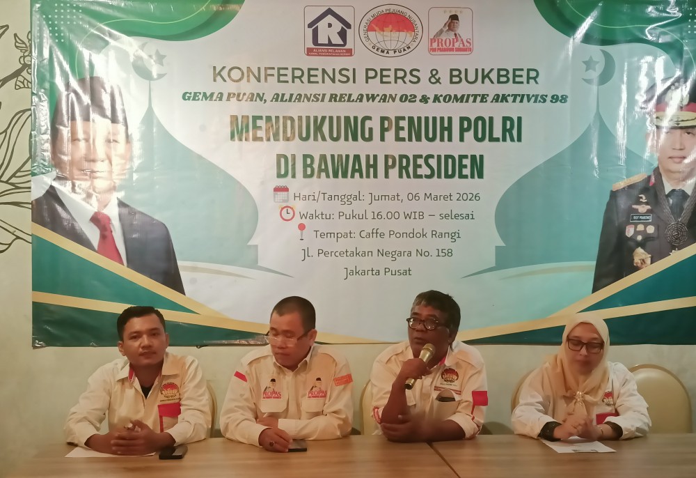 Jakarta, JNcom – Generasi Muda Pejuang Nusantara (GEMA PUAN), Aliansi Relawan Kawal Pemerintahan Bersih Pra Prabowo Subianto (PROPAS) dan Komite Aktivis 98 menegaskan dukungannya terhadap posisi Kepolisian Republik Indonesia dibawah Presiden. Penegasan tersebut disampaikan Ridwan, Ketua GEMA PUAN dalam konferensi pers di bilangan Rawasari Jakarta, Jumat (6/3/2026).