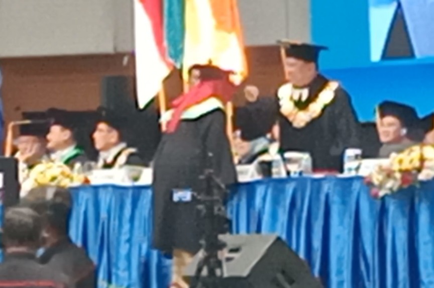 Sementara itu, Menteri Koordinator Bidang Perekonomian Republik Indonesia, Dr. (H.C.) Ir. Airlangga Hartarto, M.B.A., M.M.T dalam orasi mengajak para lulusan untuk meneguhkan tegas menuju Indonesia Emas 2045 yaitu Indonesia maju, berdaulat dan berdaya saing global serta memiliki ekonomi kuat.